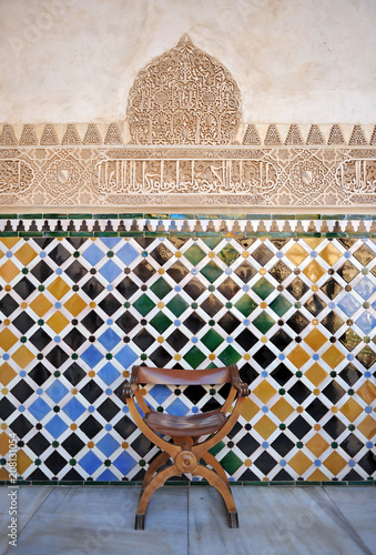 Silla Arabe Con Fondo De Azulejos Y Yeseria En El Patio De Los Arrayanes Palacio De La Alhambra De Granada Patrimonio De La Humanidad Por La Unesco Andalucia Espana Buy This