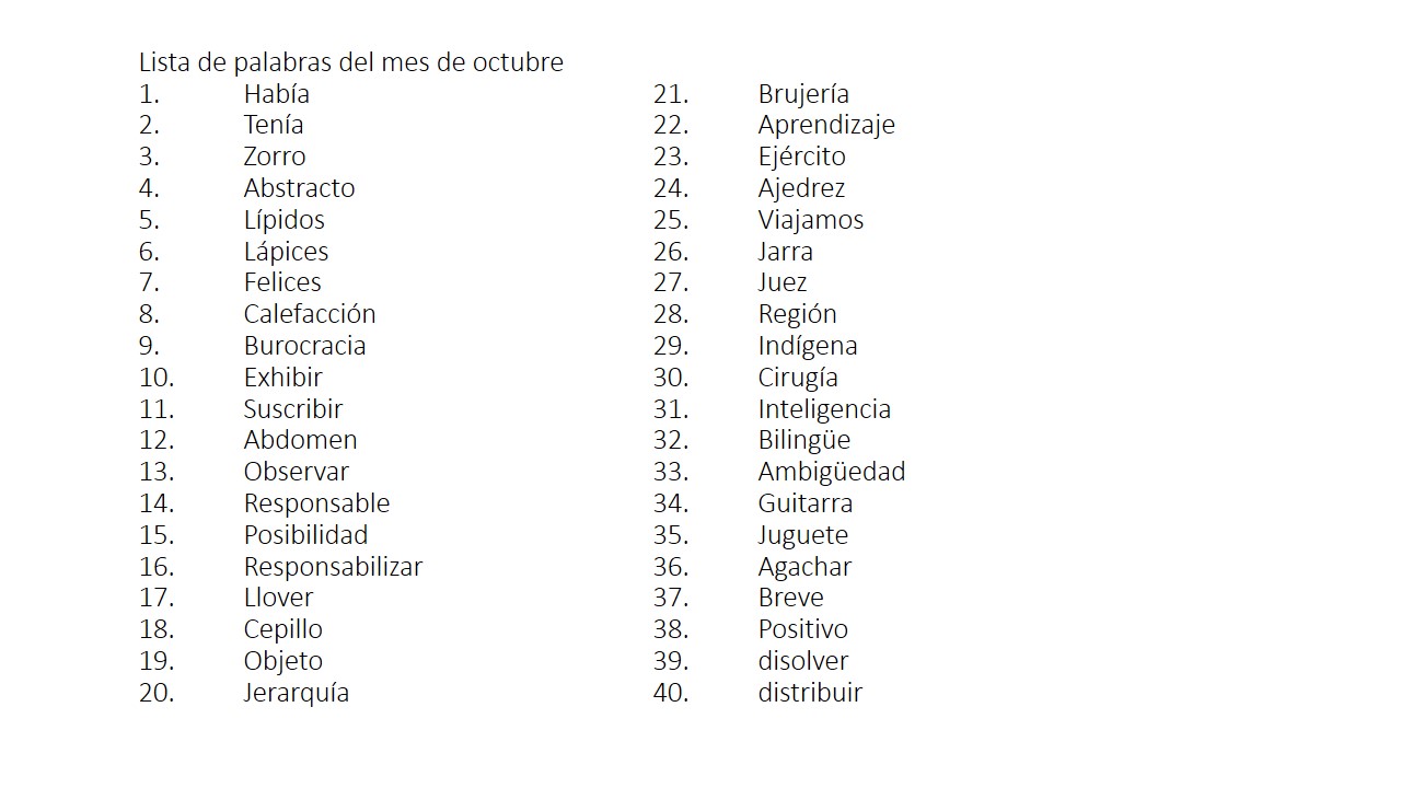 Instituto Juarez 5 Primaria Lista De Palabras Del Mes De Octubre Espanol
