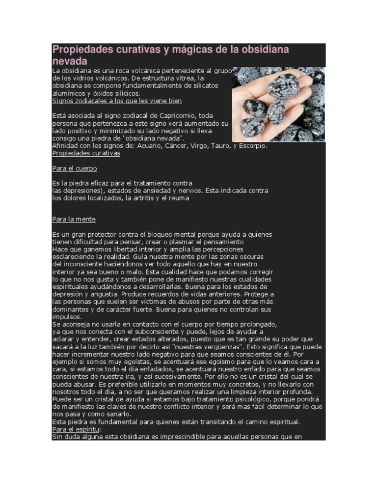 Piedra obsidiana nevada propiedades. Esta piedra trabaja en el sistema nervioso para aliviar problemas como la ansiedad y los cuadros de estrés. Segundo tiene las propiedades metafísicas que ayudarán en una serie de situaciones siempre y cuando lleves esta piedra. La obsidiana nevada es una piedra de equilibrio y transformación. Ayuda a la evolución.